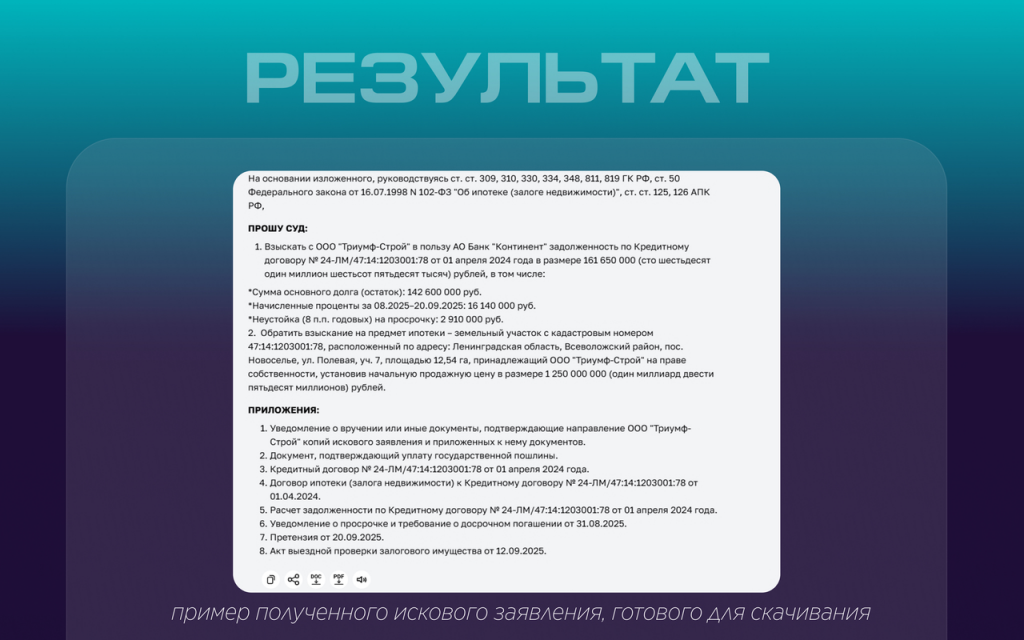 ИИ автоматически соберет текст с фактами, аргументацией и списком приложений. Когда всё загружено — просто напишите в чат «Составь иск».